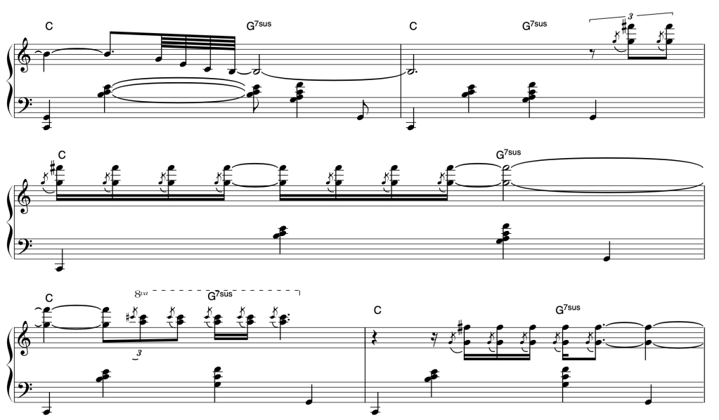 Evans approaches this section, a four-bar phrase, with a familiar, descending arpeggiation of the tonic chord. The 7th of the CMA7 serves as the third of the dominant harmony that follows. The serene nature of the piece begins to unravel as the pianist introduces a striking G5-F#6 dyad that is prefaced with a G5 grace note. The effect is startling.