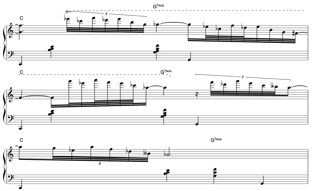 Measures forty-seven through forty-nine exhibit a greater sense of dissonance than Evans had experimented with since the onset of the improvisation. Some writers have suggested that he is employing bi-tonality or atonality here, however I disagree with that assessment.